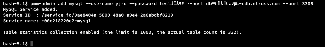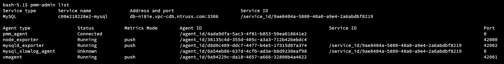 - Service name: PMM 클라이언트 내에서 서비스가 식별되는 이름. 여기서는 c00e218220e2-mysql 입니다.