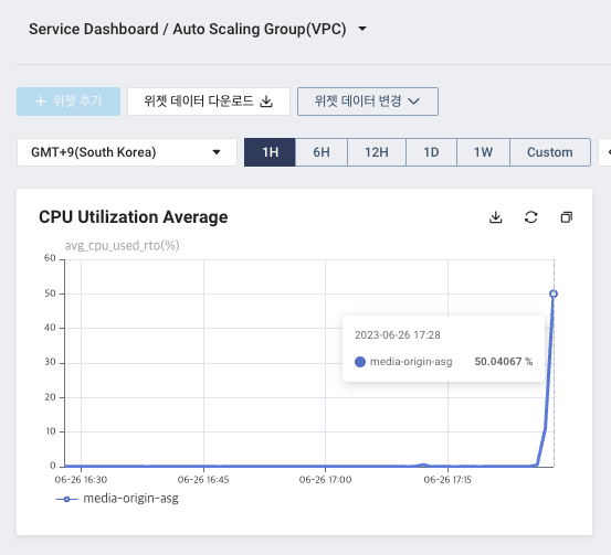 Cloud insight > Service Dashboard 에서 Auto Scaling Group(VPC)을 선택하여 CPU Utilization Average를 확인해보면 평균 사용량이 50프로까지 올라간 모습을 확인할 수 있다.