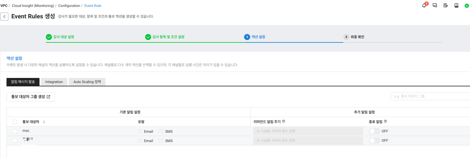 통보 대상자 그룹 그리고 오토스케일링 정책 액션을 설정합니다.