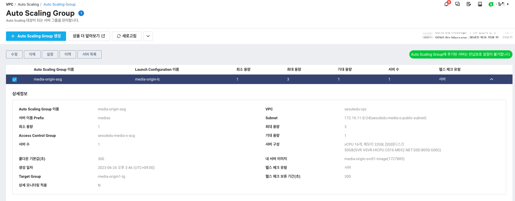 아까 만든 Launch Configuration 서버 템플릿을 선택하고 최소 용량, 최대용량, 기대용량을 설정해줍니다.