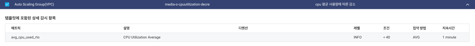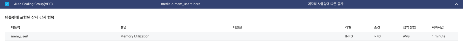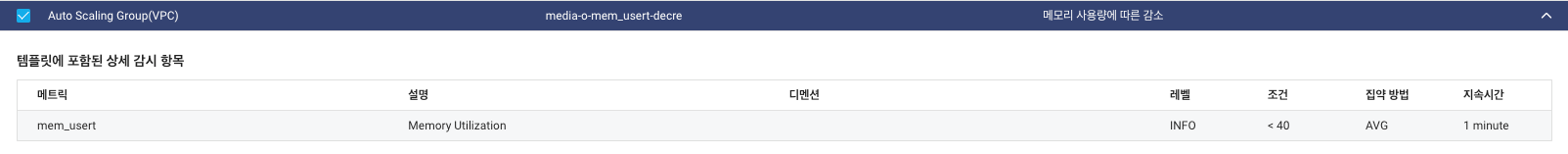 저는 메모리 평균 사용량이 40% 이상이 1분 지속되면 서버 증가, 40% 이하가 1분 지속되면 서버 감소 되도록 설정을 해놓았습니다.