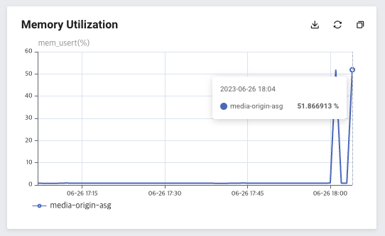 Cloud insight > Service Dashboard 에서 Auto Scaling Group(VPC)을 선택하여 Memory Utilization를 확인해보면 평균 사용량이 51프로까지 올라간 모습을 확인할 수 있다.
