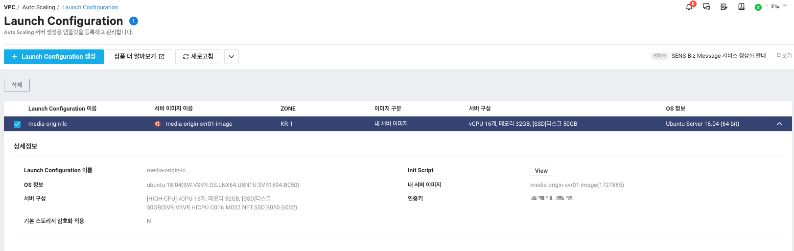 Auto Scaling > Launch Configuration에서 오토스케일링을 위한 서버 템플릿 생성합니다.