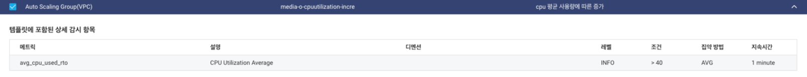 마찬가지로 cpu 평균 사용량이 40% 이상이 1분 지속되면 서버 증가, 40% 이하가 1분 지속되면 서버 감소 되도록 설정을 해놓았습니다.