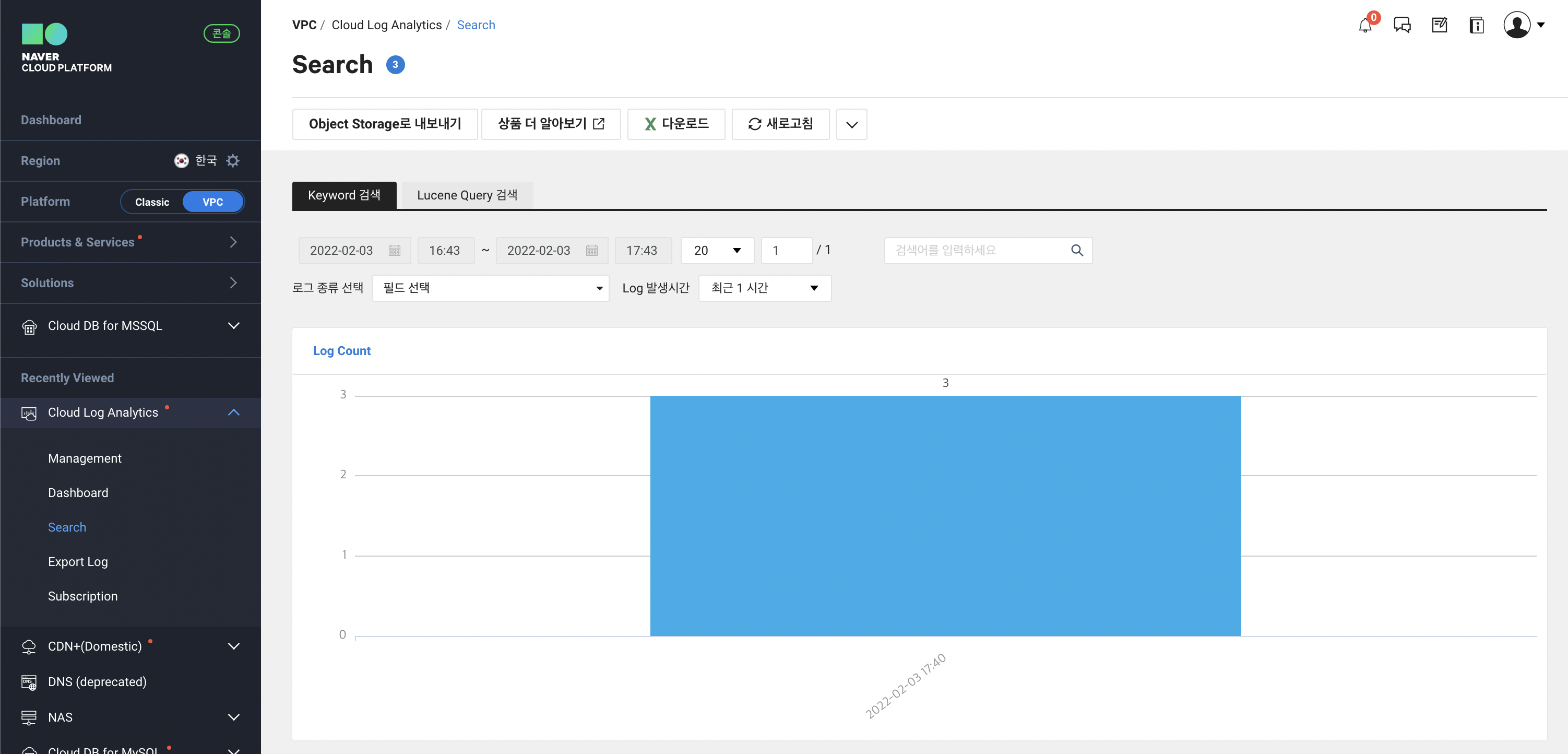 Cloud Log Analytics > Search 에서 다양한 검색 기능을 활용하여 원하는 데이터를 찾아 볼 수 있습니다.
