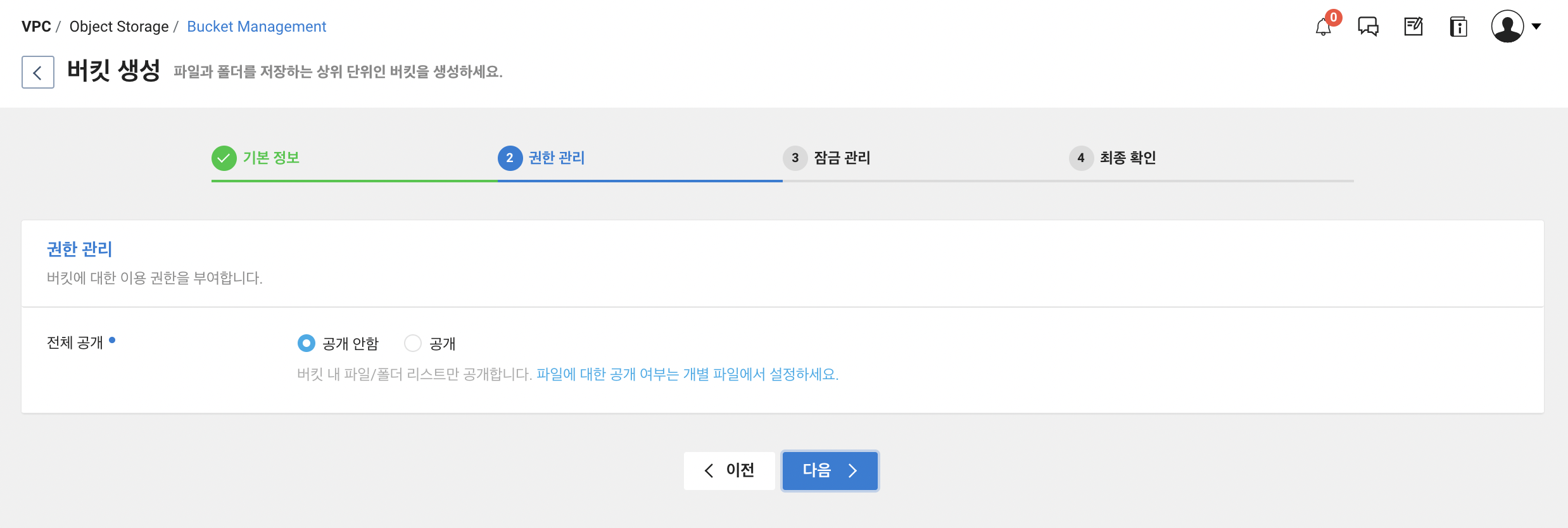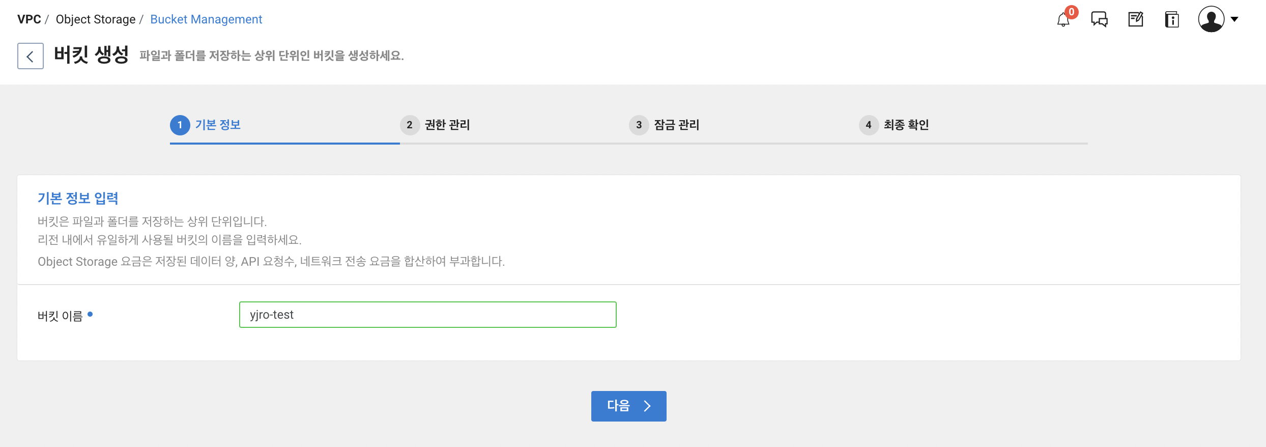 이제 로그를 내보낼 object storage bucket 을 생성할 것 입니다.