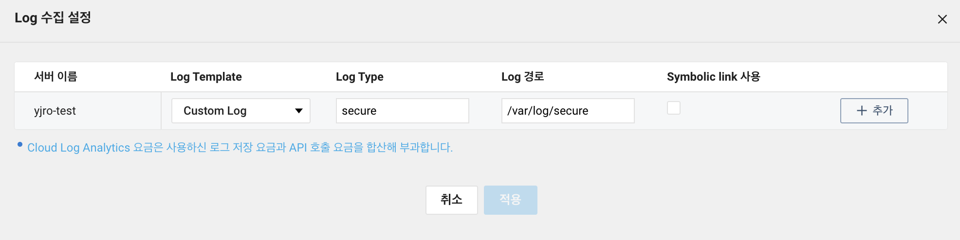 수집 설정 > Log 수집 설정에서 Log Template, Log Type, Log 경로, Symblic link 사용 등을 지정하시고 "추가"를 누른 후 적용해주세요.