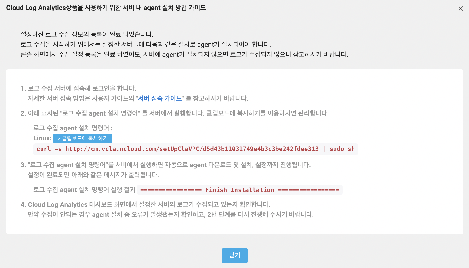 Cloud Log Analytics 상품을 사용하기 위해서는 서버에 agent 를 설치해야합니다.